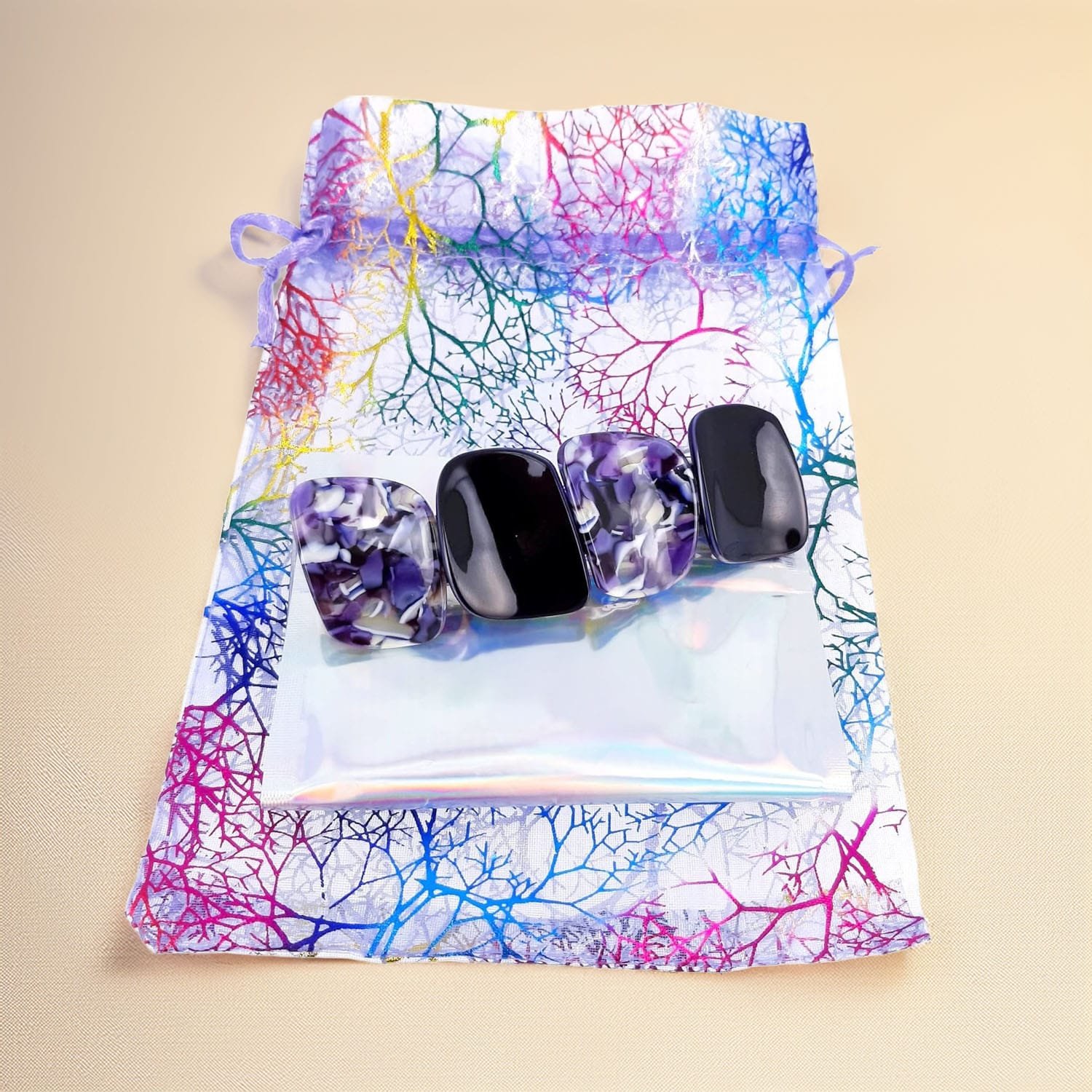 Pensée pour les femmes qui aiment exprimer leur style à travers les détails, cette barrette mêle audace et raffinement. Sa teinte violette marbrée, ponctuée de nuances nacrées, reflète la lumière avec élégance et habille instantanément la chevelure d’une touche artistique.