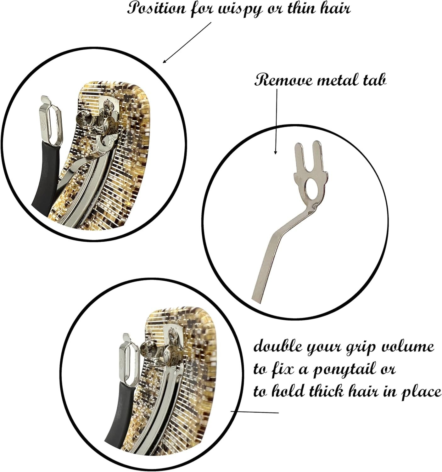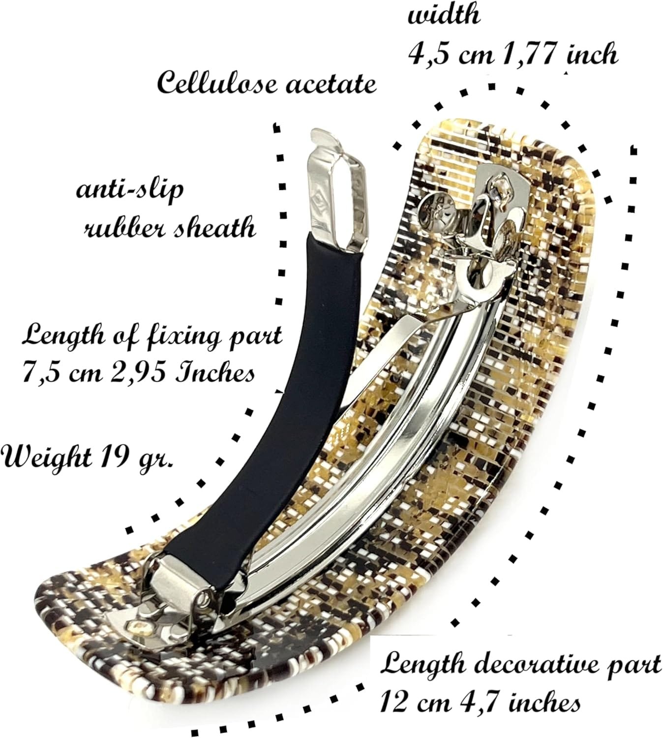 Cette barrette est équipée d’un fermoir métallique à double pression, conçu pour s’adapter à votre volume de cheveux.