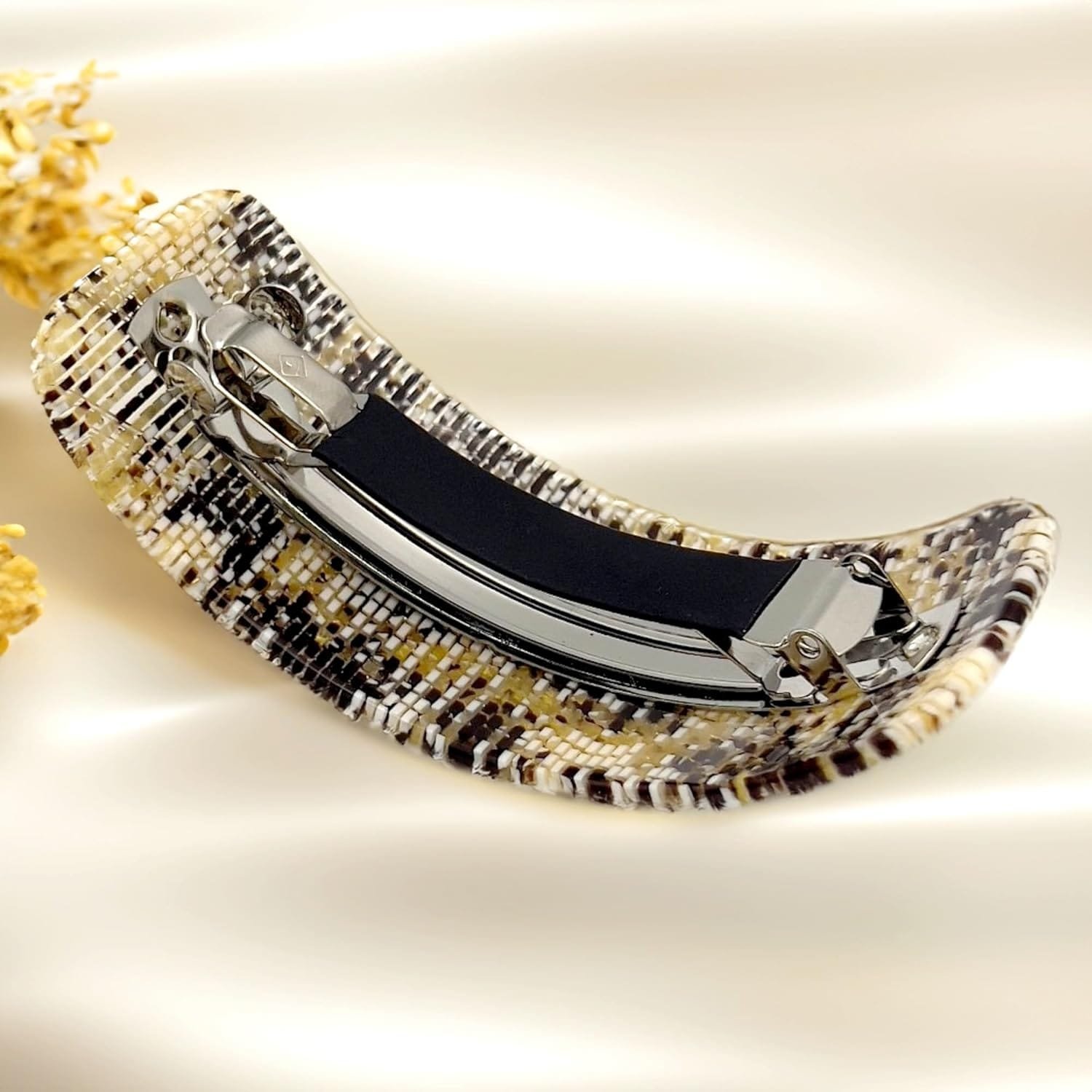 Son design texturé, inspiré des nuances naturelles et des motifs haut de gamme, fait de cette barrette un accessoire aussi élégant qu’un bracelet ou une broche.