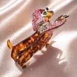 Le corps du teckel est sculpté dans un acétate de cellulose premium écaille ambre — les taches noires traversent toute l’épaisseur du matériau. La veste florale est imprimée avec une précision qui préserve les détails sur une surface de quelques centimètres. Le mécanisme tient les cheveux sans les abîmer.
