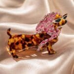 Sur un chignon, le teckel se pose de côté, visible de profil. Sur cheveux lâchés, il retient une mèche latérale. Sur une tresse, il fixe l’extrémité. Il fonctionne en solo ou en duo avec le teckel rayé pour un effet de collection mémorable.