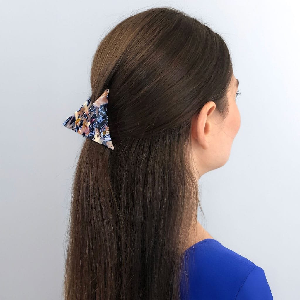 Pince à cheveux triangle en acétate (petit format 7,5 × 4,5 × 3,8 cm, 17 g). Picots croisés pour un maintien efficace sans tirer — idéal mèches, cheveux fins ou courts. 6 couleurs créateur, pochette offerte, livraison 48 h.