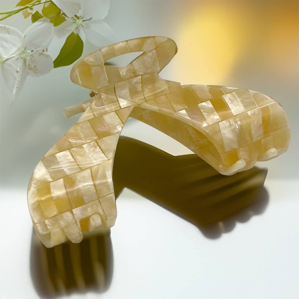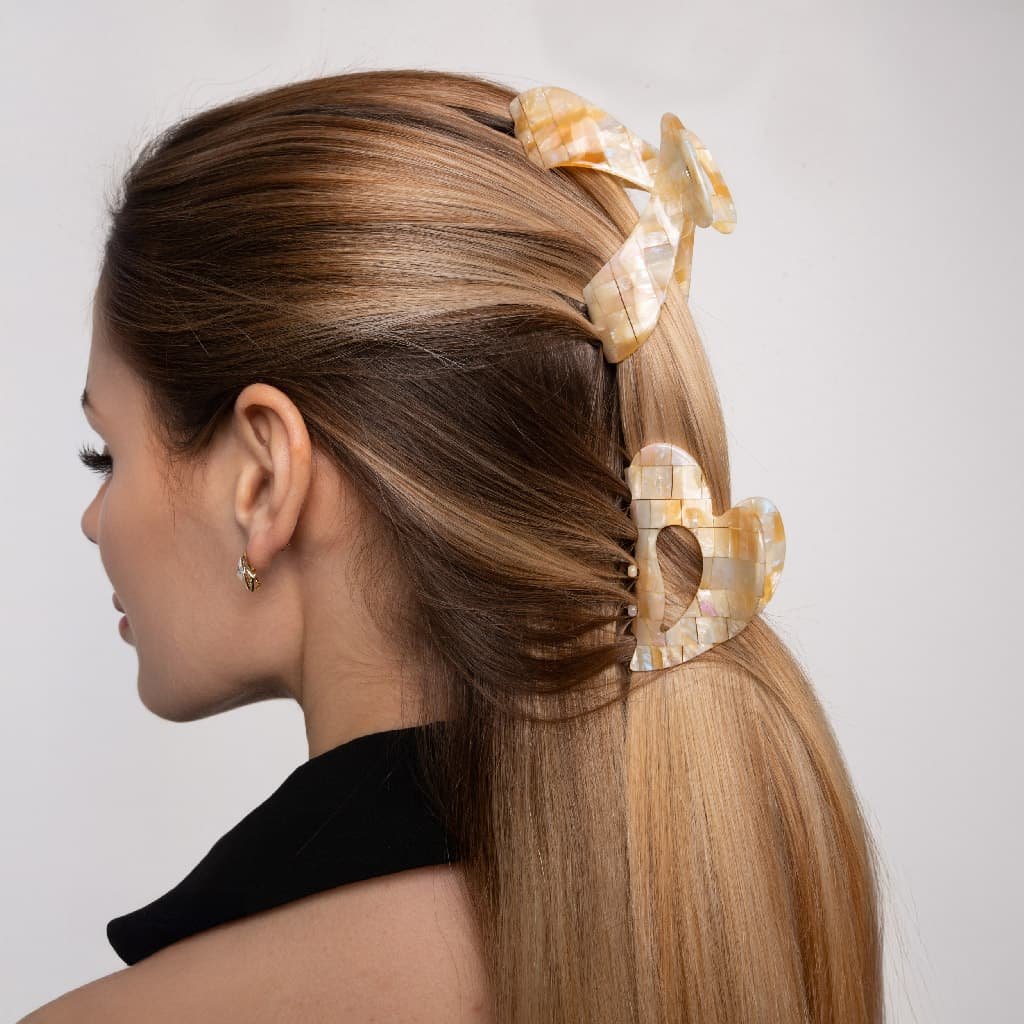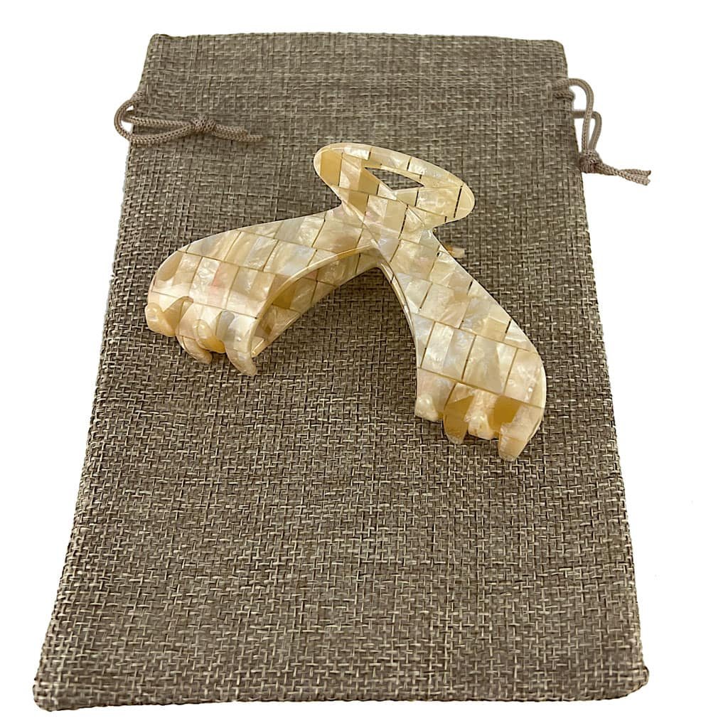 Pince cheveux blanche nacrée en acétate premium. Design torsadé, maintien parfait et brillance naturelle. Élégance intemporelle signée ClawMeUp Paris.