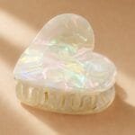 La version Blanc Nacré de cette pince à cheveux cœur opte pour une séduction sans ostentation. La surface nacrée diffuse une lumière froide et douce, avec ces micro-reflets irisés caractéristiques de l’acétate de qualité. Le blanc nacré n’est jamais criard — il s’approche du blanc naturel d’une perle de culture, légèrement chaud par endroits, légèrement bleuté sous d’autres angles. Cette pince cœur blanche se porte autant avec une chemise blanche qu’avec une robe noire.