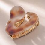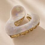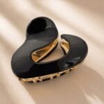 La pince design organique courbe ne ressemble à rien de ce qu’on a déjà vu dans les rayons. Sa forme en teardrop — arrondie sur le dessus, qui s’effile vers le bas — est à la fois douce et structurée. C’est une pince qu’on remarque sur la tête de quelqu’un dans le métro et qu’on cherche ensuite sur Internet. En acétate, métal doré, avec un maintien discret mais ferme.