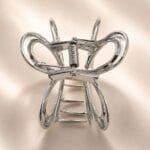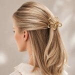 La pince cheveux fleur dorée est proposée en deux finitions acier inoxydable : or chaud aux reflets solaires, argent poli aux reflets froids. Même forme, même maintien, deux ambiances distinctes. La version dorée appelle les tenues en lin beige, les chemises blanches, les robes de lin l’été. La version argentée se glisse dans les looks plus graphiques, les couleurs neutres, le noir.
