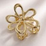 La pince cheveux fleur dorée, c’est un bijou de tête qui s’assume. Cinq pétales ajourés en fil de métal acier inoxydable, formant une fleur ouverte que la lumière traverse — rien d’opaque, rien de lourd. Le résultat : une pièce qui retient les cheveux avec une fermeté qu’on ne soupçonne pas à la regarder.