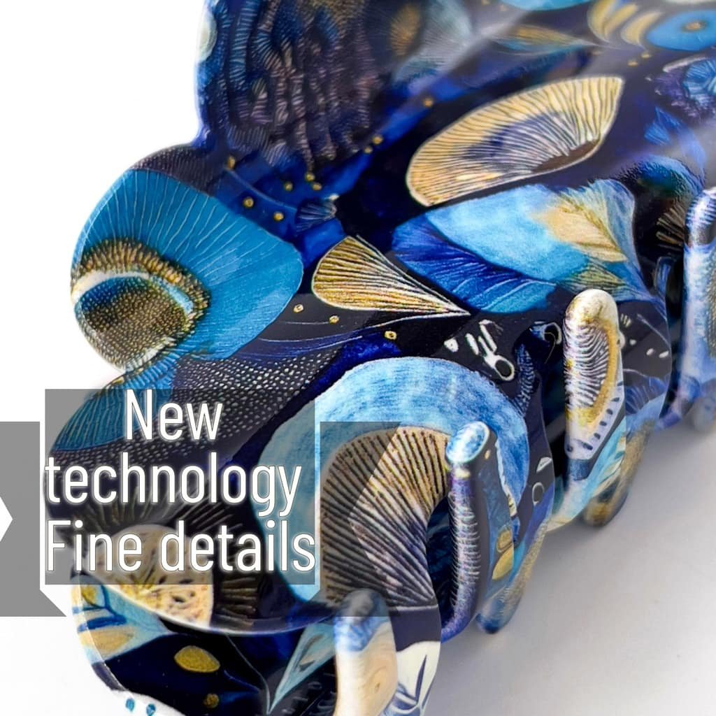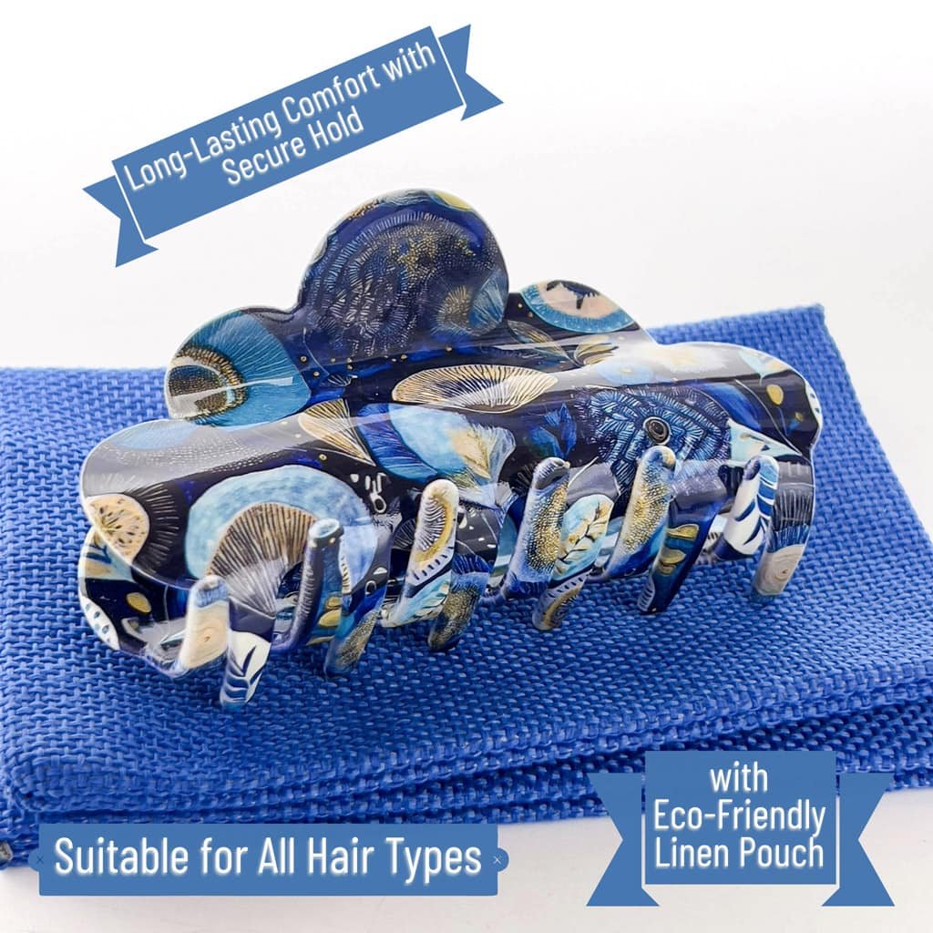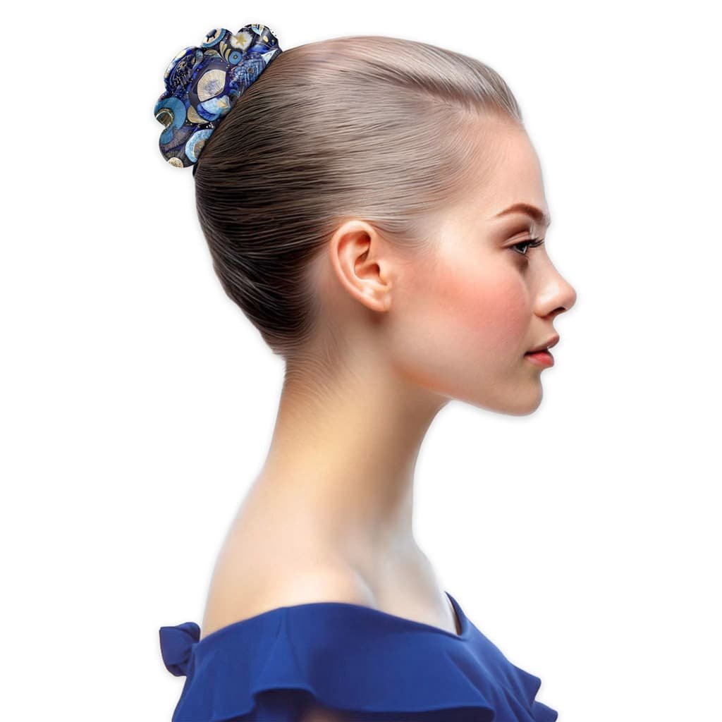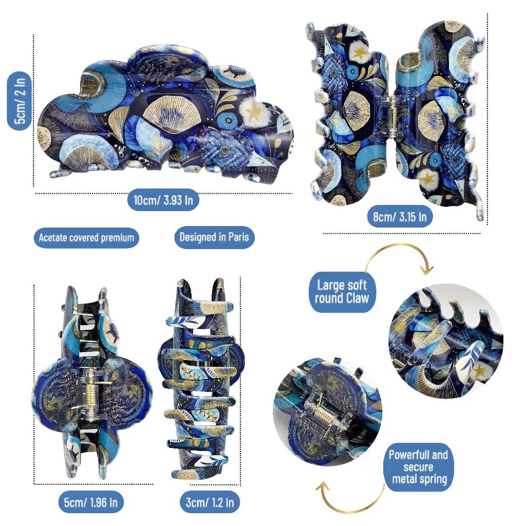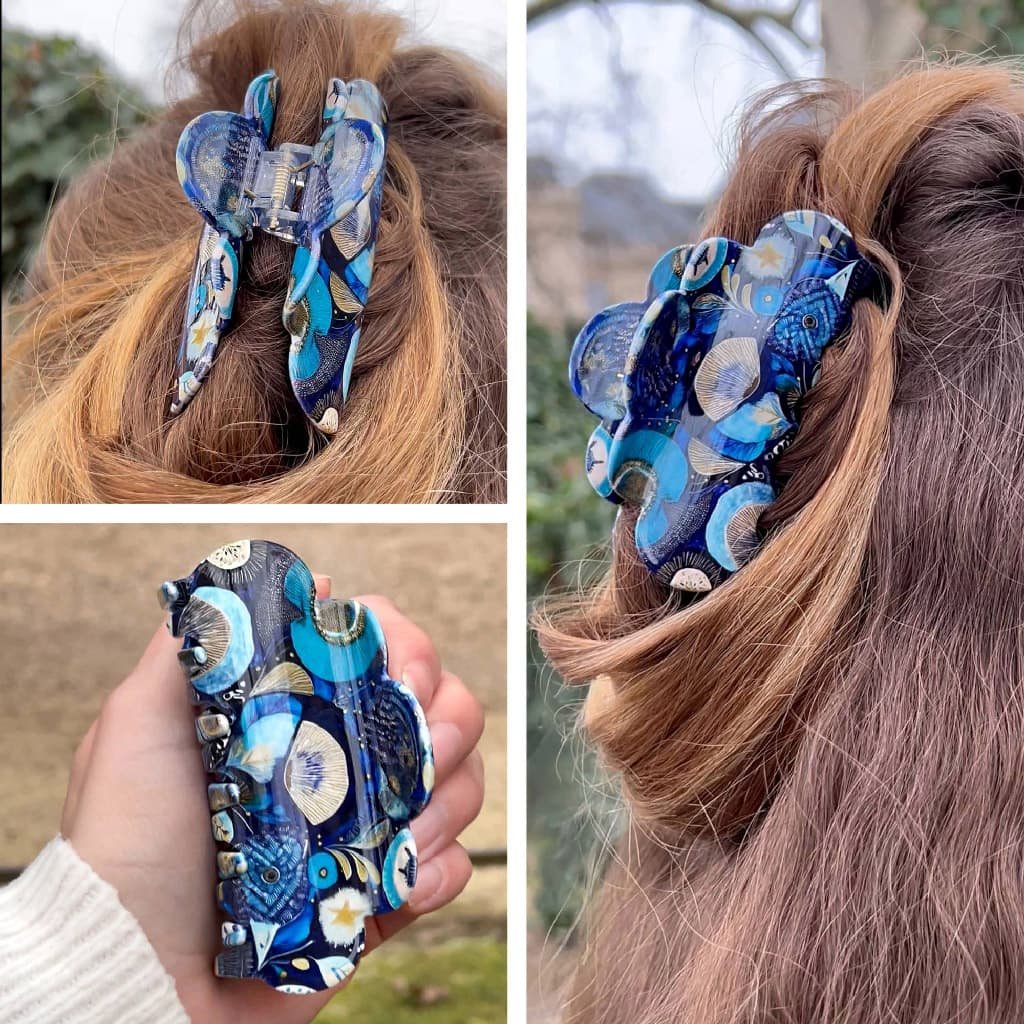 Pince cheveux en acétate de cellulose avec impression UV haute définition. Son motif floral bleu et doré, imprimé avec précision, sublime toutes les chevelures. Élégante, résistante, et 100 % originale.