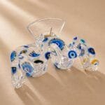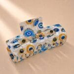 Cette pince à cheveux nazar mesure environ 6 à 8 cm dans sa plus grande dimension. C’est une pince de taille moyenne — parfaite pour une demi-queue, pour maintenir les cheveux hors du visage, ou pour clips un chignon léger. Le mécanisme crabe intérieur est en acier, avec un ressort calibré pour un maintien quotidien fiable.