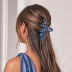 La pince cheveux ondulée trace une ligne en S dans les cheveux. Cette forme — ni droite, ni courbée en arc classique — est ce qui la rend immédiatement reconnaissable. Posée sur un demi-chignon ou en maintien latéral, elle crée une ligne de coiffure qu’on voit et qu’on retient. En acétate marbré, métal doré pour le gris ou métal argenté pour le bleu.