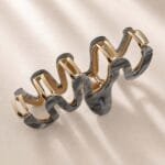 Pince cheveux ondulée acétate marbré, métal doré. Forme en S distinctive, maintien latéral. 2 coloris — 14€.
