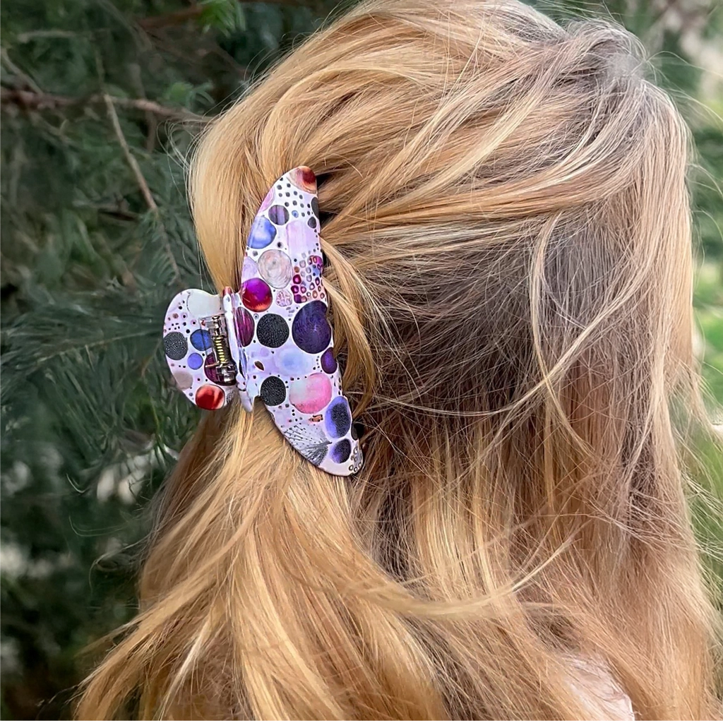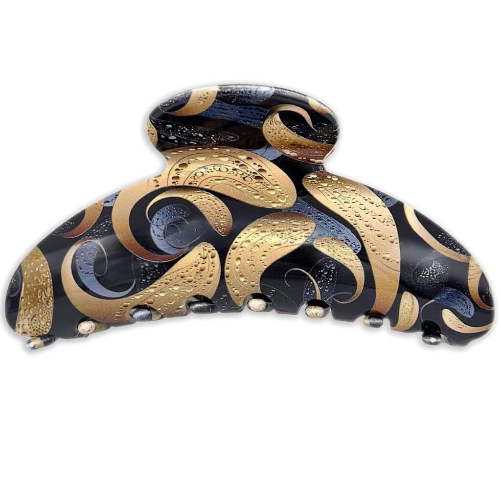 Affirmez votre style avec cette pince cheveux originale noire et dorée au motif abstrait. Son design artistique en acétate de cellulose, sa tenue parfaite et sa fabrication soignée en font un accessoire aussi élégant qu’audacieux. Idéale pour sublimer toutes vos coiffures, cette pince de 10,5 cm allie praticité, maintien et raffinement. Un bijou de cheveux pensé pour les femmes qui veulent se démarquer avec goût.