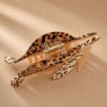 Le choix du motif léopard pour cette pince tortue n’est pas anodin. L’écaille léopard — ce mélange de brun ambré, de noir et de beige — est l’un des motifs les plus portables de la mode : il s’accorde avec les neutres, les couleurs vives, les imprimés floraux. Sur la forme d’une tortue, ce motif prend une dimension supplémentaire : il évoque les carapaces des tortues marines réelles, dont les écailles naturelles présentent effectivement ces variations de brun. Une cohérence visuelle qui renforce le réalisme de la sculpture.