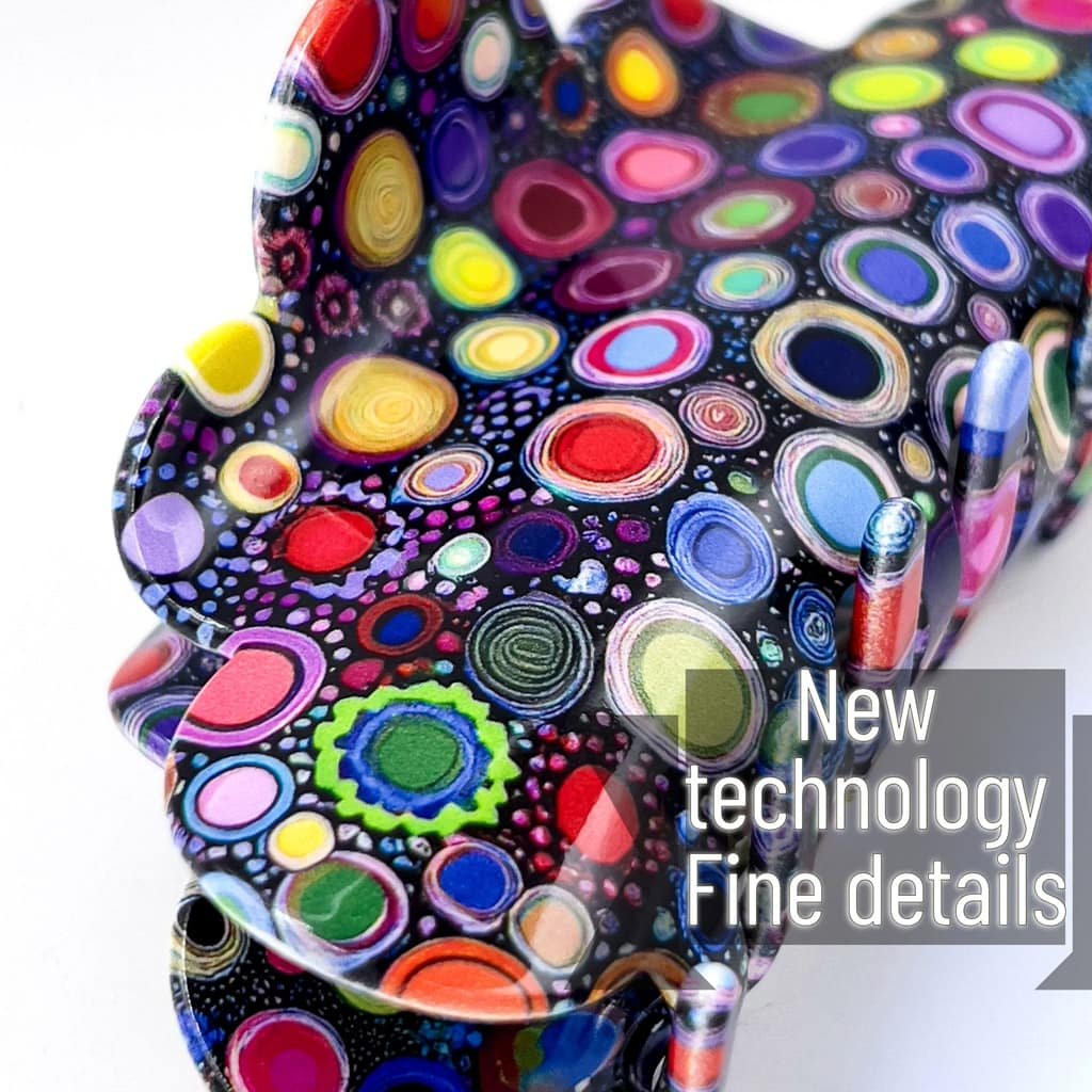 Sa surface ornée de cercles multicolores, presque hypnotiques, capte la lumière et attire naturellement le regard.