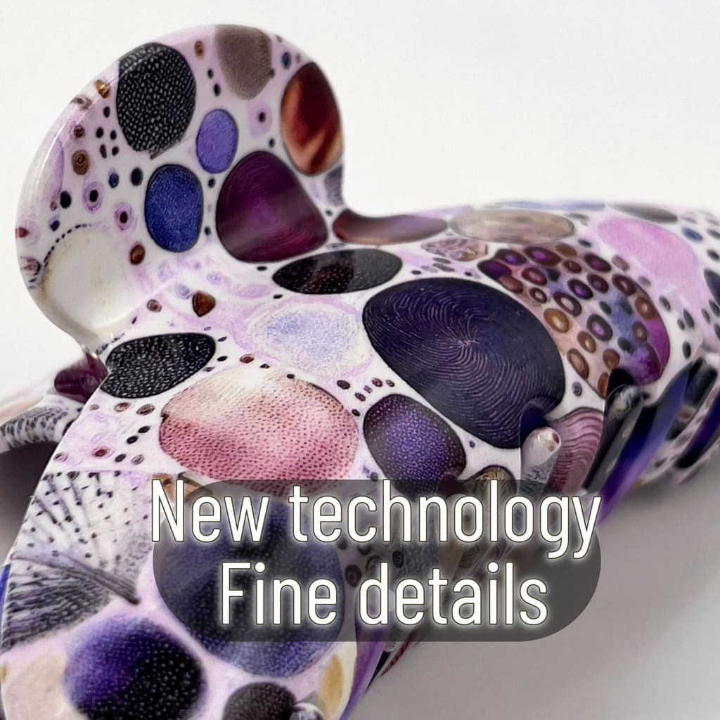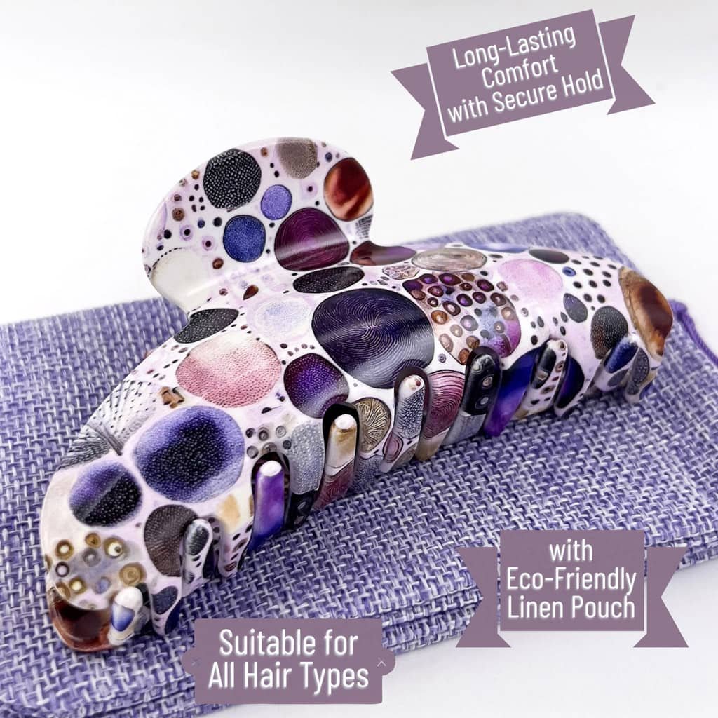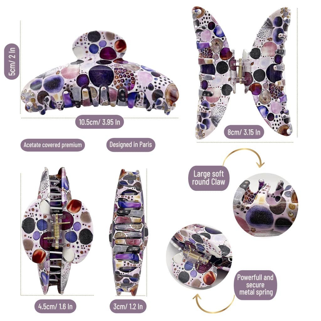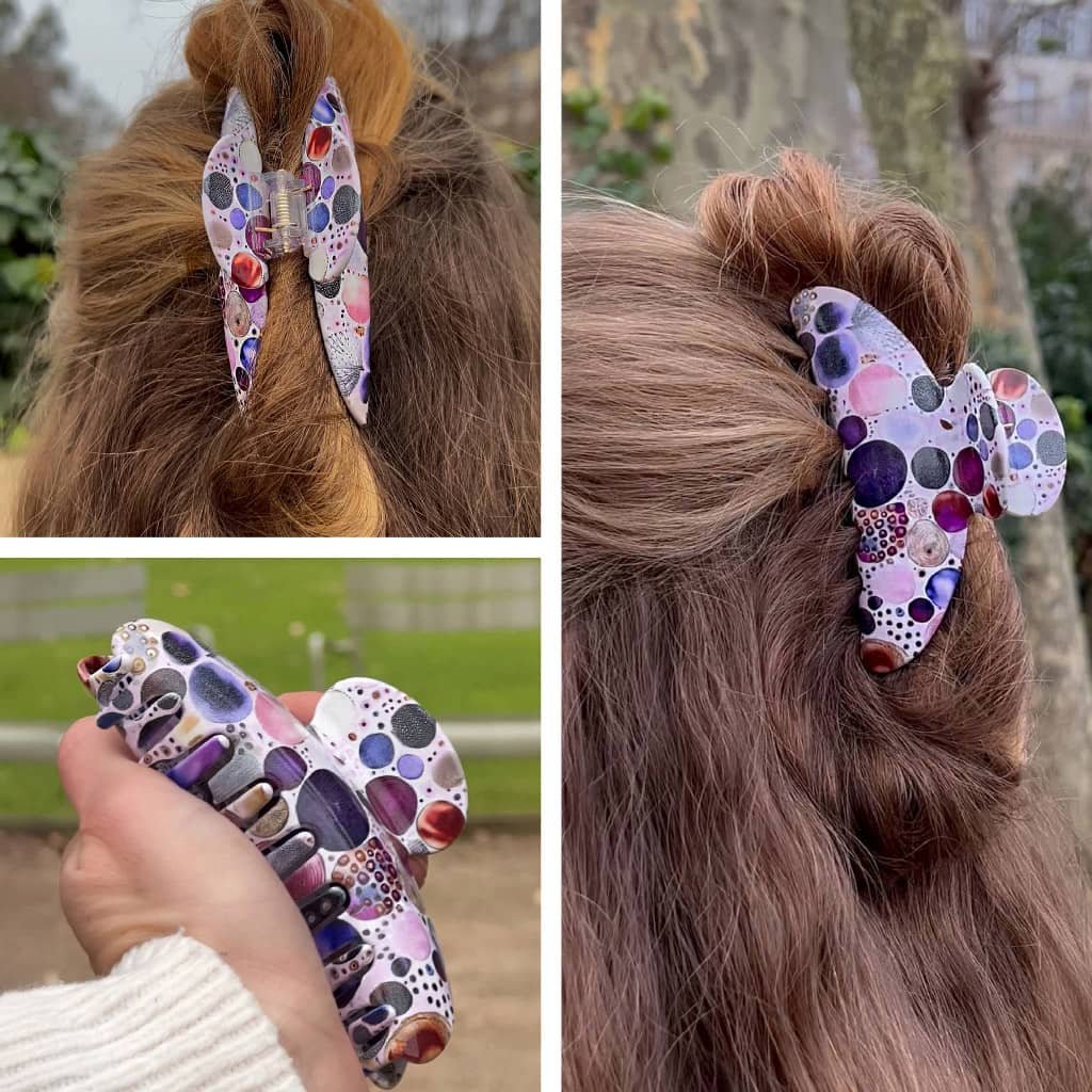 Chaque pince est façonnée dans un acétate de cellulose haut de gamme, puis polie à la main pour révéler toute la richesse de son design artistique. Les motifs, mêlant violet profond, doré lumineux et nuances nacrées, évoquent un univers à la fois chic et onirique — celui de la féminité libre et assumée.