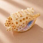 La première pince à cheveux marin de ce duo reproduit fidèlement la forme d’un coquillage côtier. Sa surface nacrée capte la lumière avec ce scintillement particulier aux matières marines — ni métallique, ni plastique, mais organique et vivant. L’acétate nacré utilisé pour cette pince présente des variations subtiles de couleur selon l’angle d’observation : tantôt blanc pur, tantôt ivoire rosé, avec des reflets dorés qui apparaissent sous la lumière naturelle. Un vrai bijou de coiffure.